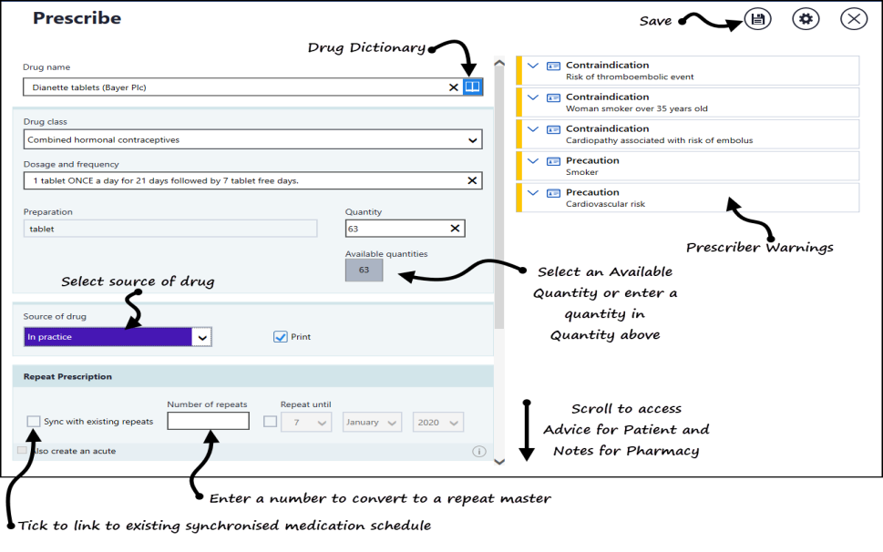 - Source of Drug - Defaults to In Practice, select from the available list to update if required.Note - Print is disabled if the Source of drug is elsewhere.