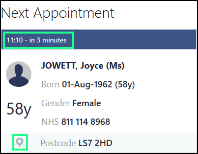 Your next appointment displays with the booked time and a count down, along with patient demographic information.