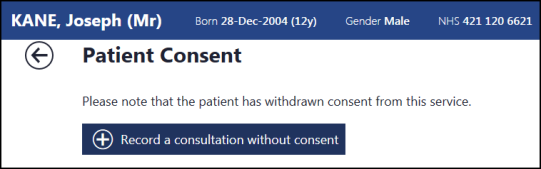 If a patient has dissented to share their record with the service, when a consent reason is chosen, the message "Please note that the patient has withdrawn consent from this service" displays.