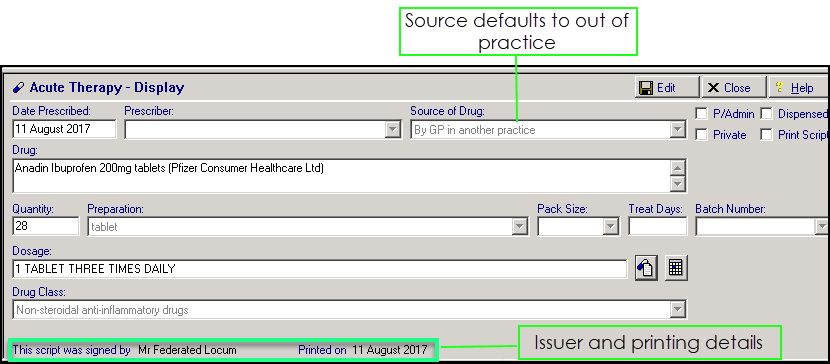 When the entry is viewed, the source displays as By GP in another practice. If the prescription was printed, the printed date also displays.