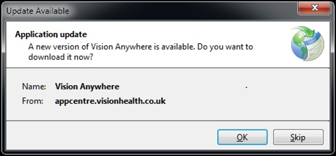When a new update is available, the next time you access Vision Anywhere you are automatically prompted to download and install as follows: