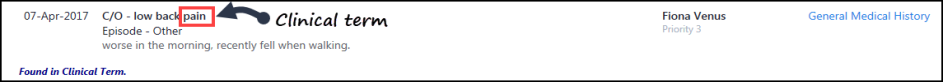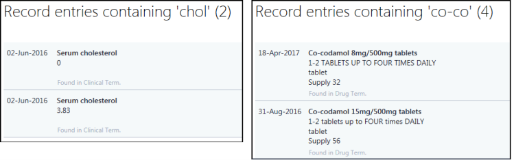 Any matching coded and free text entries display. The examples below show the results of a search on "pain".