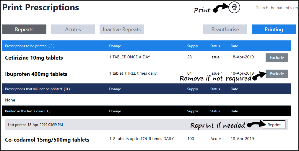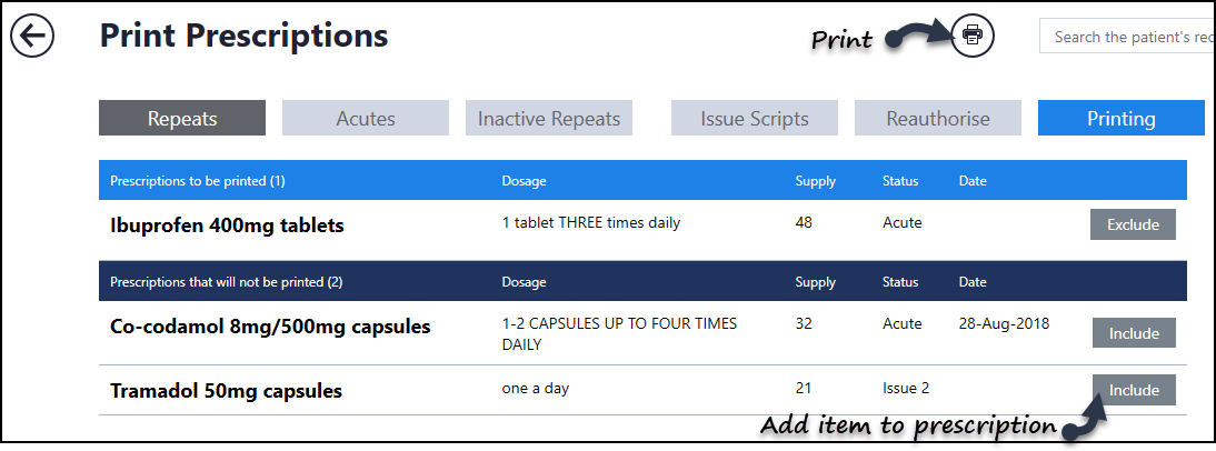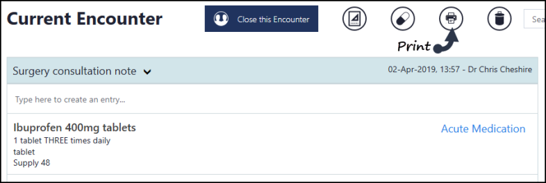 After adding acute(s) or issuing repeat medication, these can be printed from the either the main Medication screen or the current Encounter.