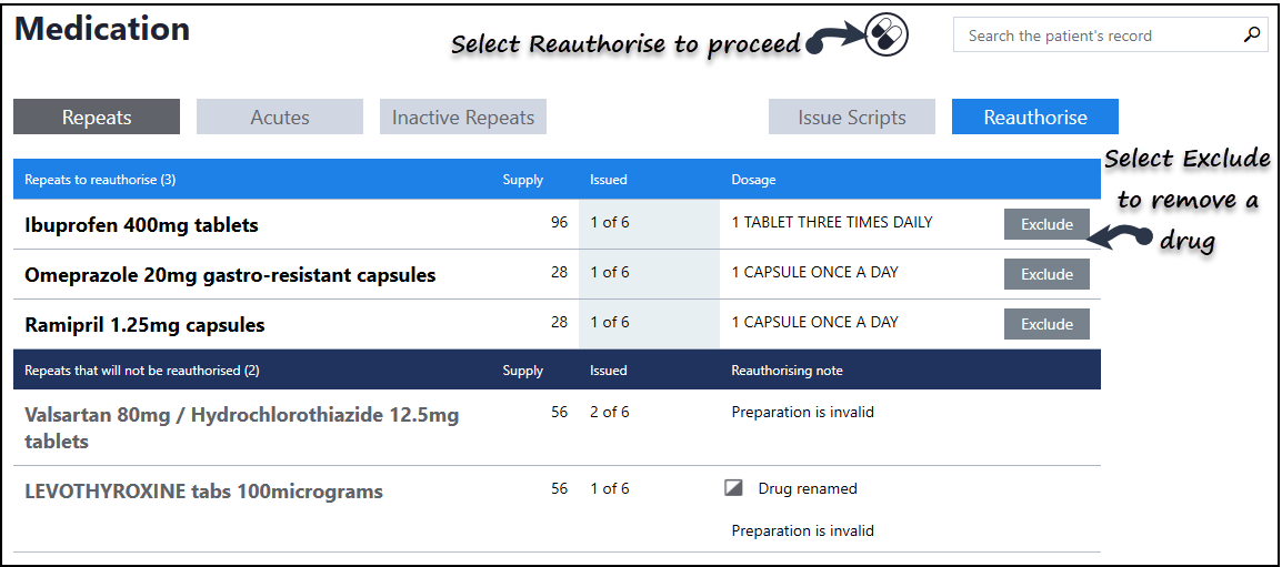 - Select Reauthorise and a list of valid drugs for reauthorisation displays.