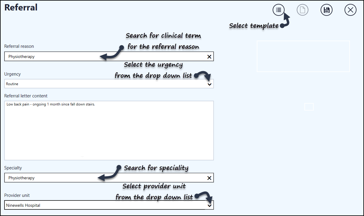 - Enter the Referral letter content if required, this transfers into the referral letter.