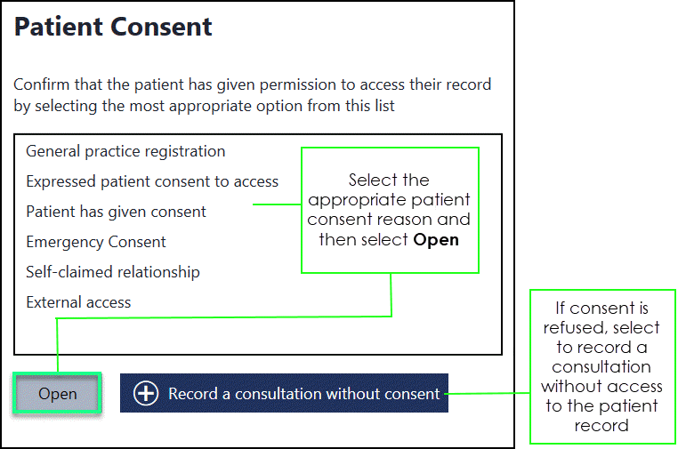 The clinician must record patient consent, confirming that the patient has given permission to access their record by selecting the most appropriate option. These reasons are agreed with the shared care service, examples are given below: