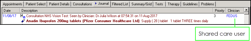 Medication prescribed in a Shared Care setting displays with Federated User, FEDUS, in the Clinician column in Vision 3.
