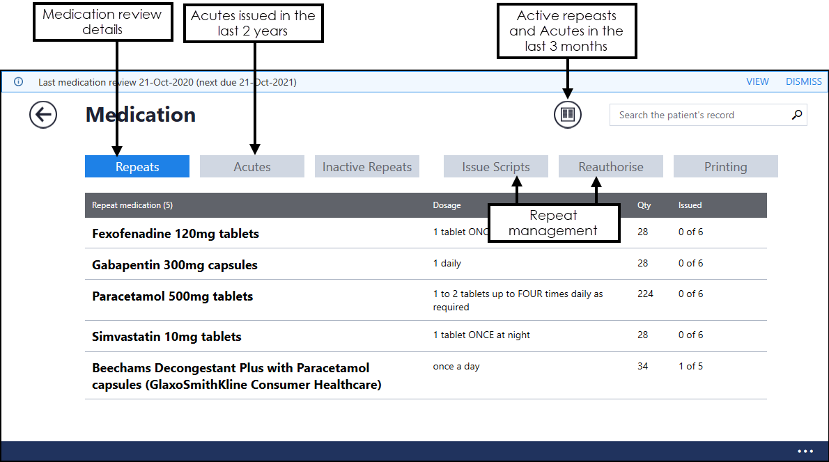 - Select to display all acute and repeat medication issued in the last 3 months: