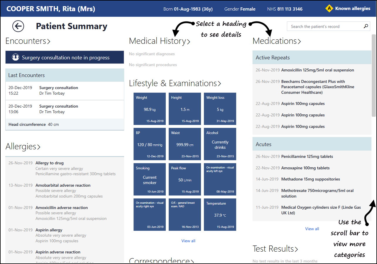 The Patient Summary screen gives a snapshot of all the essential clinical information you need: