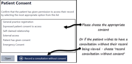 In the event of the patient refusing consent to view and wanting a consultation, the Record a consultation without consent option is available.