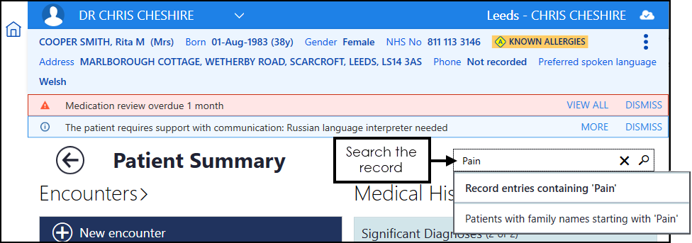 Use Search the patient record to quickly find a record using either a clinical term, free text or medication name: