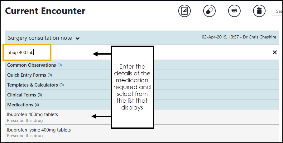 - From a Current Encounter with an encounter type selected, in Type here to create an entry enter the details of the medication required. A combination of drug name, strength and form can be used to refine your search, for example, ibup 400 tab to find Ibuprofen 400mg tablets.