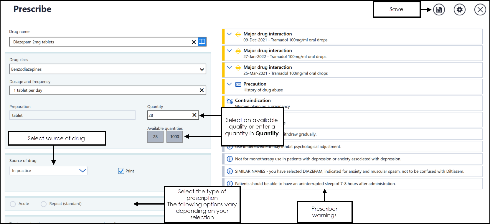 Note - When adding a prescription for a Controlled Drug item, a warning displays in orange if you enter more than a 30 day supply into Quantity. This utilises the calculated daily dose set in Dosage and frequency.