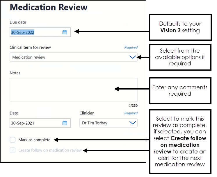 Due date - Defaults to your Vision 3 setting, select the date you want the patient to be reviewed.
