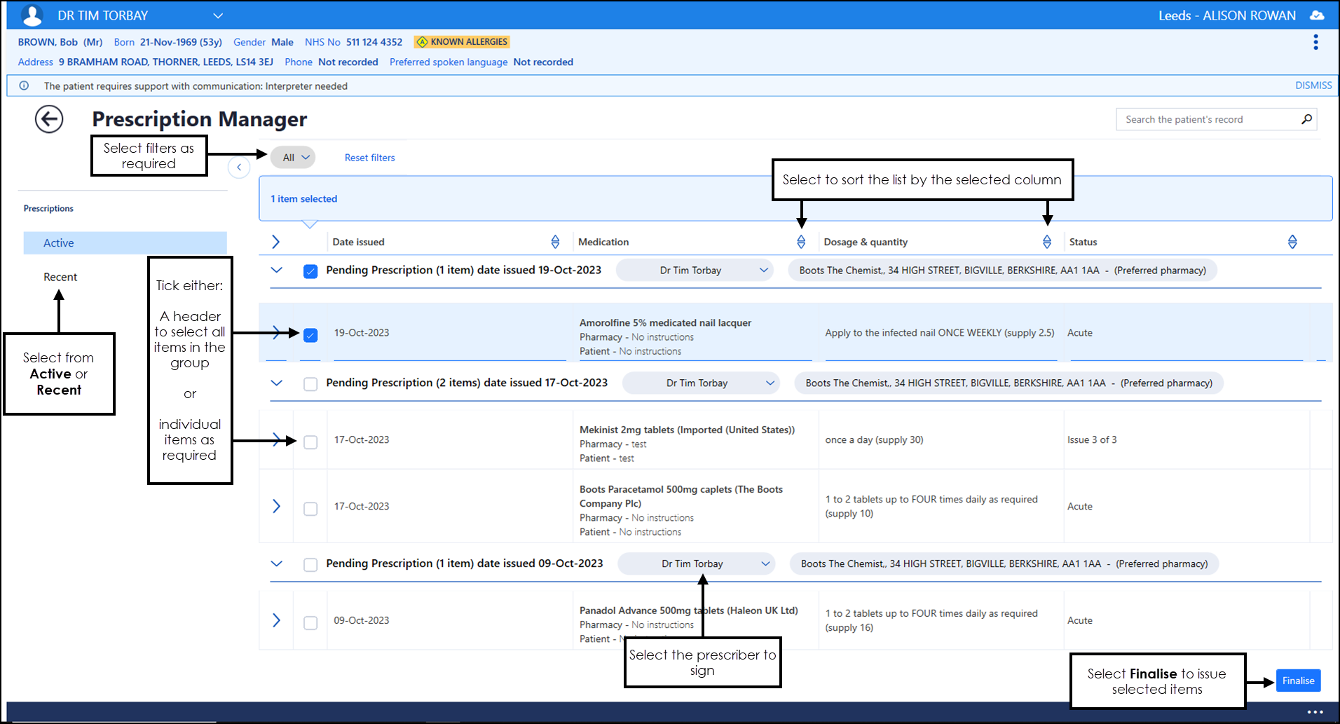 The Prescription Manager screen consists of the following sections, both sections group items as controlled drugs, contraceptives and standard items: