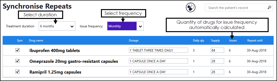 When recording new repeat medication, this can be synchronised with the existing schedule.
