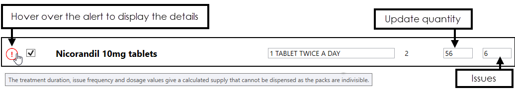 - Packs are indivisible - The treatment duration, issue frequency and dosage values give a calculated supply that cannot be dispensed as the packs are indivisible: