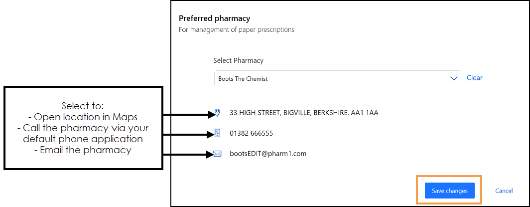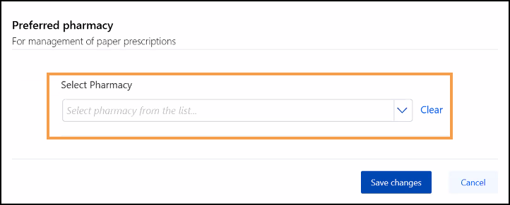 To add or update the pharmacy selected, select Change and the Preferred Pharmacy screen displays, select from the list available and select Save changes.