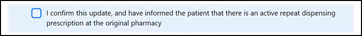 If a patient has active Repeat Dispensing items for the Pharmacy they are moving from, the 'I confirm this update, and have informed the patient that there is an active repeat dispensing prescription at the original pharmacy' message displays at the bottom of the Preferred pharmacy screen. Tick to continue: