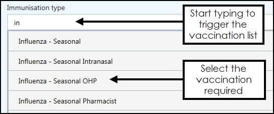 • Immunisation type - Using keywords, select the immunisation required if not populated by the dynamic search bar: