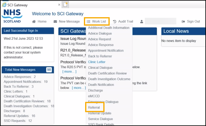 The Welcome to the SCI Gateway screen displays, select the type of message required, for example Referral.