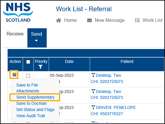 The relevant Work List screen displays, locate the message to update, select the Additional Menu and then Send Supplementary.