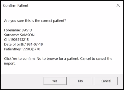 6. If a patient is not identified from the message, the Continue import screen displays, if you want to continue, select Import and select the patient in the usual way, see Selecting a Patient for details if required.