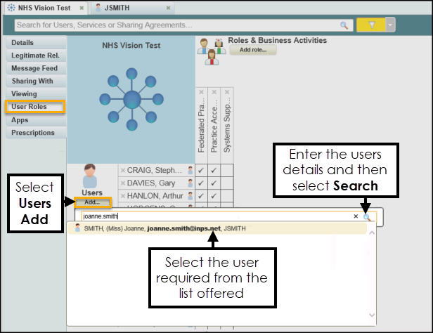 - Check to see if the user already exists, see Searching for a User in a Shared Care Setting for details.