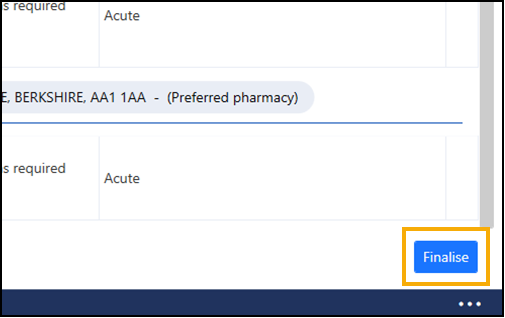 Finalise - The Print option is updated to Finalise. Select Finalise to issue all items available to issue across all prescription groups. You do not need to select them first: