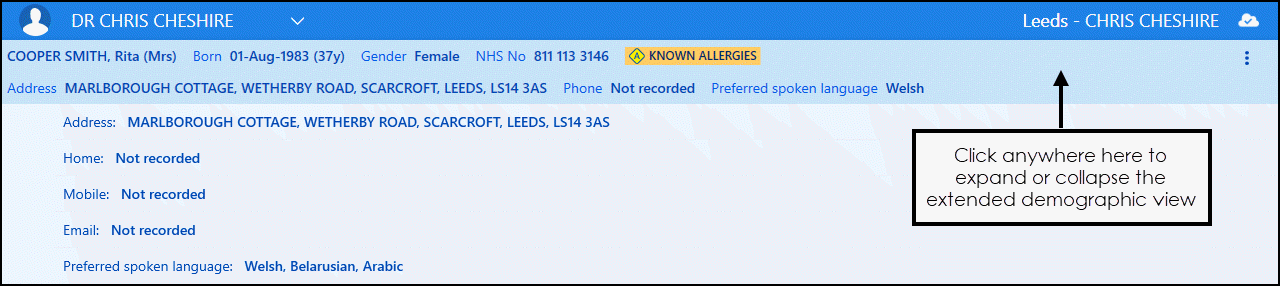 Patient Banner - You can now display additional demographic details from the Patient Banner, simply click anywhere on the Patient Banner to expand and collapse: