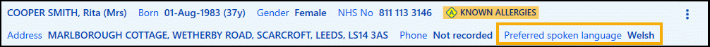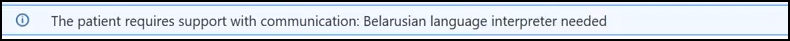 Interpreter - The latest Interpreter entry, with a clinical term from the SNOMED CT reference set Accessible information - requires communication professional + need for interpreter, recorded in the patient record, now displays in an Information Banner just under the Patient Banner: