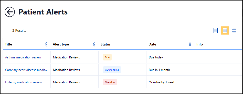 - View All - The Patient Alerts screen displays, listing all active alerts for this patient and their status. Select the medication review required and the Medication Review screen displays with the details of the medication review outstanding.