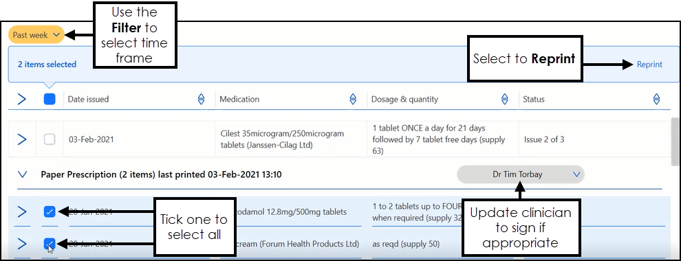 if required. Tick the item(s) you want to reprint.Training Tip - Select one item from a prescription for all of the items printed as part of that prescription to be selected. Remember, you cannot reprint part of a prescription it must be a whole reprint. - Check the clinician to sign is correct and update if required.