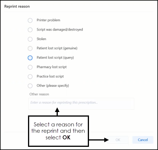 - The Reprint reason screen displays, select the reason from the available list as appropriate:Note - If you select Other, you must enter explanatory notes.