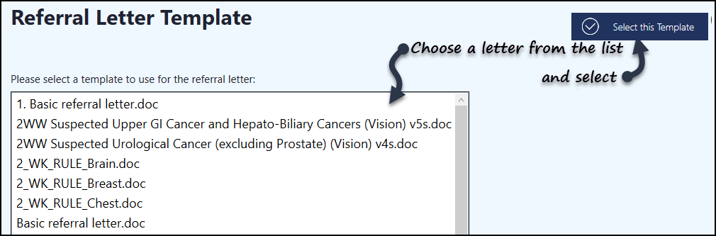 . - The Referral Letter Template view displays, select a letter from the list, followed by Select this Template. Please be aware, all of your templates display in a single list.