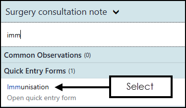 Enter 'imm' and select the Immunisation quick entry form: