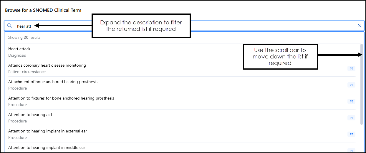 to see more options within the selected section, or use the scroll bar to select a different term.Important - Some sections of the SNOMED CT term look to be greyed out, this means the top level of the list is not available for selection. The terms within a greyed out section, can be selected, use Expand