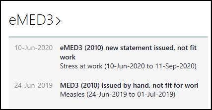 - Non GP users in a shared care setting, cannot access the eMED3 Doctor's Statement screen. If required, you can record an eMED3 as a general history entry.