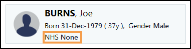 • NHS/CHI number - If a patient does not have an NHS Number recorded, NHS None displays: