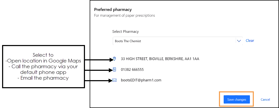 To add or update the pharmacy selected, select Change and the Preferred Pharmacy screen displays, select from the list available and select Save changes.