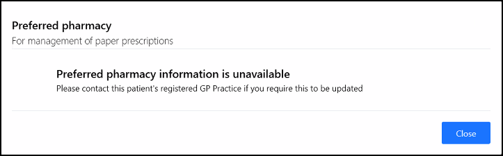 - Preferred pharmacy a 'Preferred pharmacy information is unavailable' message displays: