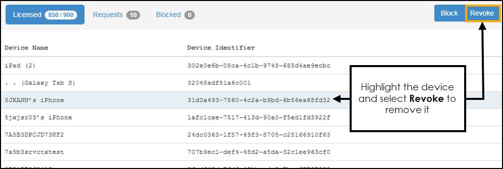 - From Licence Manager, highlight the device no longer required and select Revoke: