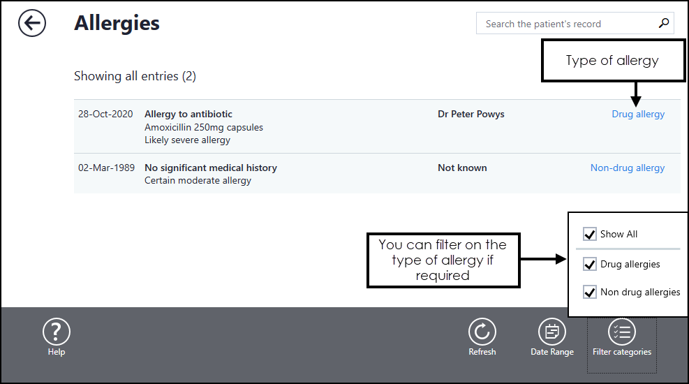 See Filtering the Patient's Record, Recording Drug Allergy and Recording a Non-Drug Allergy for details.
