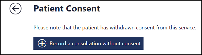 If a patient has dissented to share their record with the service, a message "Please note that the patient has withdrawn consent from this service" displays after selecting the consent reason.