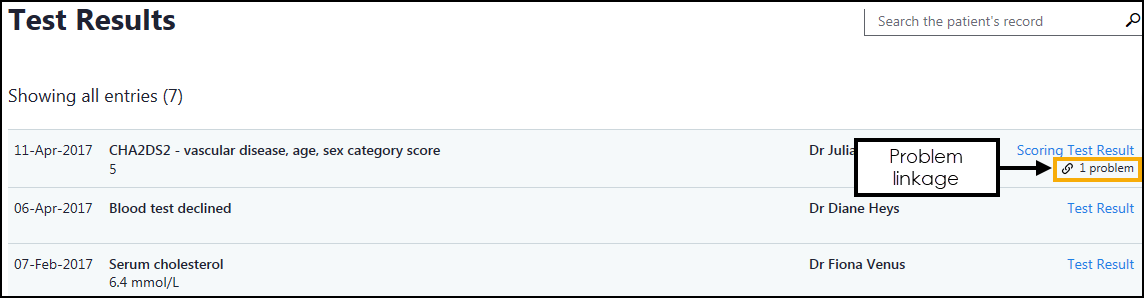 Test results display in chronological order, including problem linkage indications where appropriate.