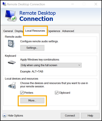 - The Remote Desktop Connection screen displays, select the Local Resources tab: