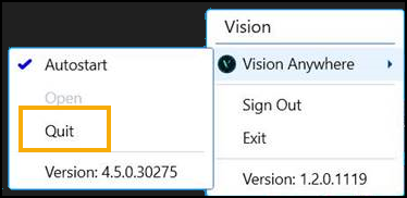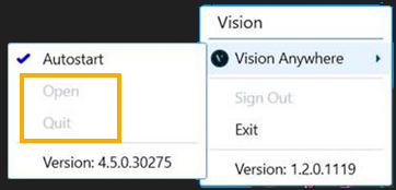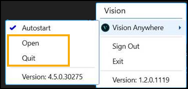 - If you are logged in but Vision Anywhere is closed, Vision Anywhere - Open and Quit are both active: