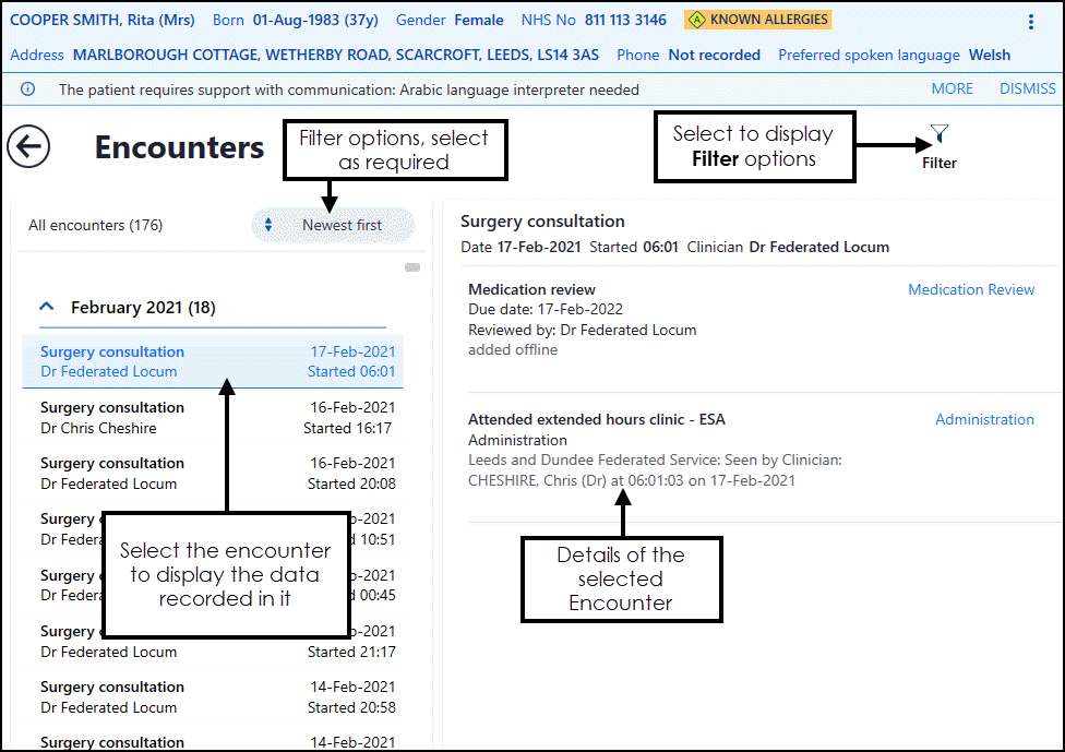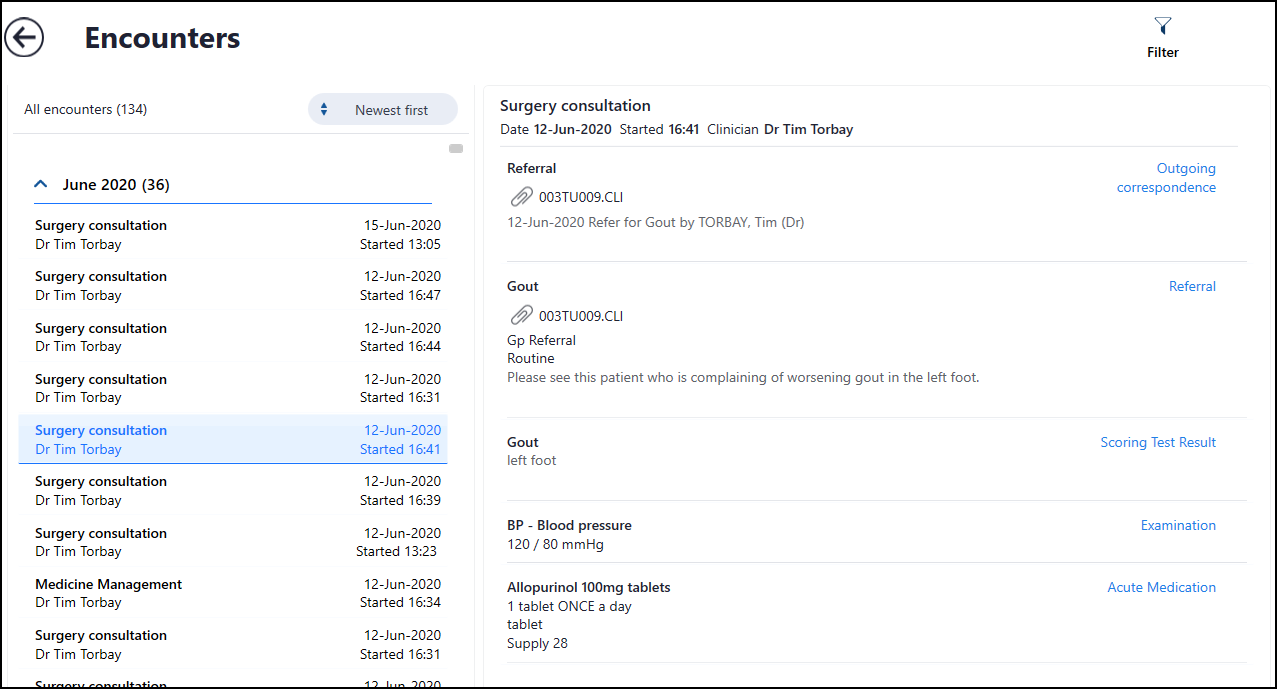 You can view and filter previously recorded encounters from the Encounters screen. This can help you get a picture of a patient's consultations over time.