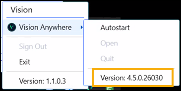 Select Vision Anywhere and your current version displays at the bottom of the menu.