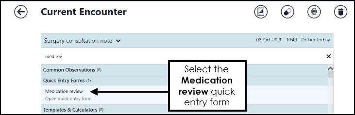 Select the appropriate Encounter type and enter 'med rev' into the . Select Medication review Open quick entry form: